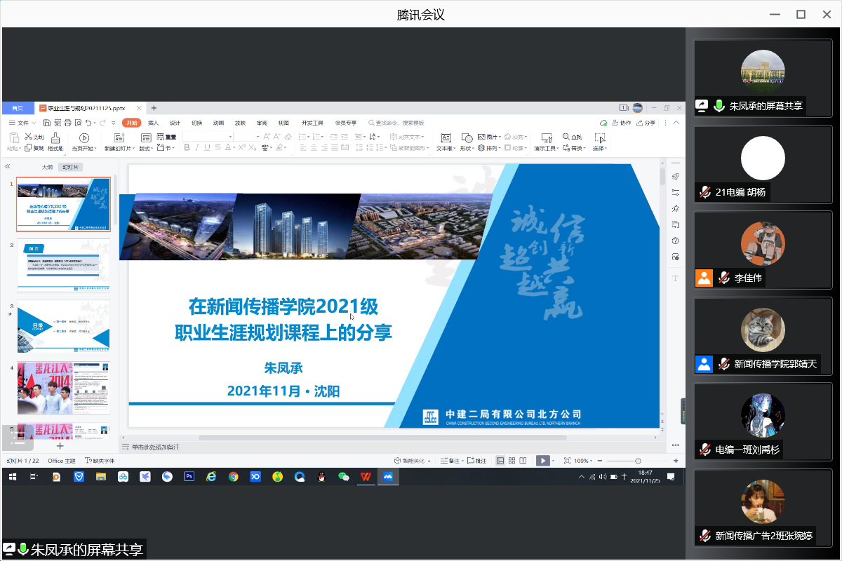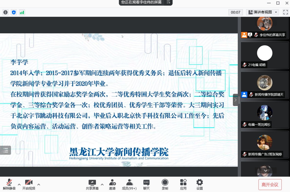 为进一步帮助2021级同学们理解职业生涯规划,把握准确专业方向,明确自身就业目标,新闻传播学院于11月25日18时线上召开职业生涯规划——职场达人经验分享会。本次会议由2021级广播电视编导一班李佳伟同学主持,新闻传播学院党委副书记衣玉梅老师、2020级辅导员吕慧杰老师、2021级辅导员郭靖天老师以及新闻传播学院2021级全体同学参加会议。