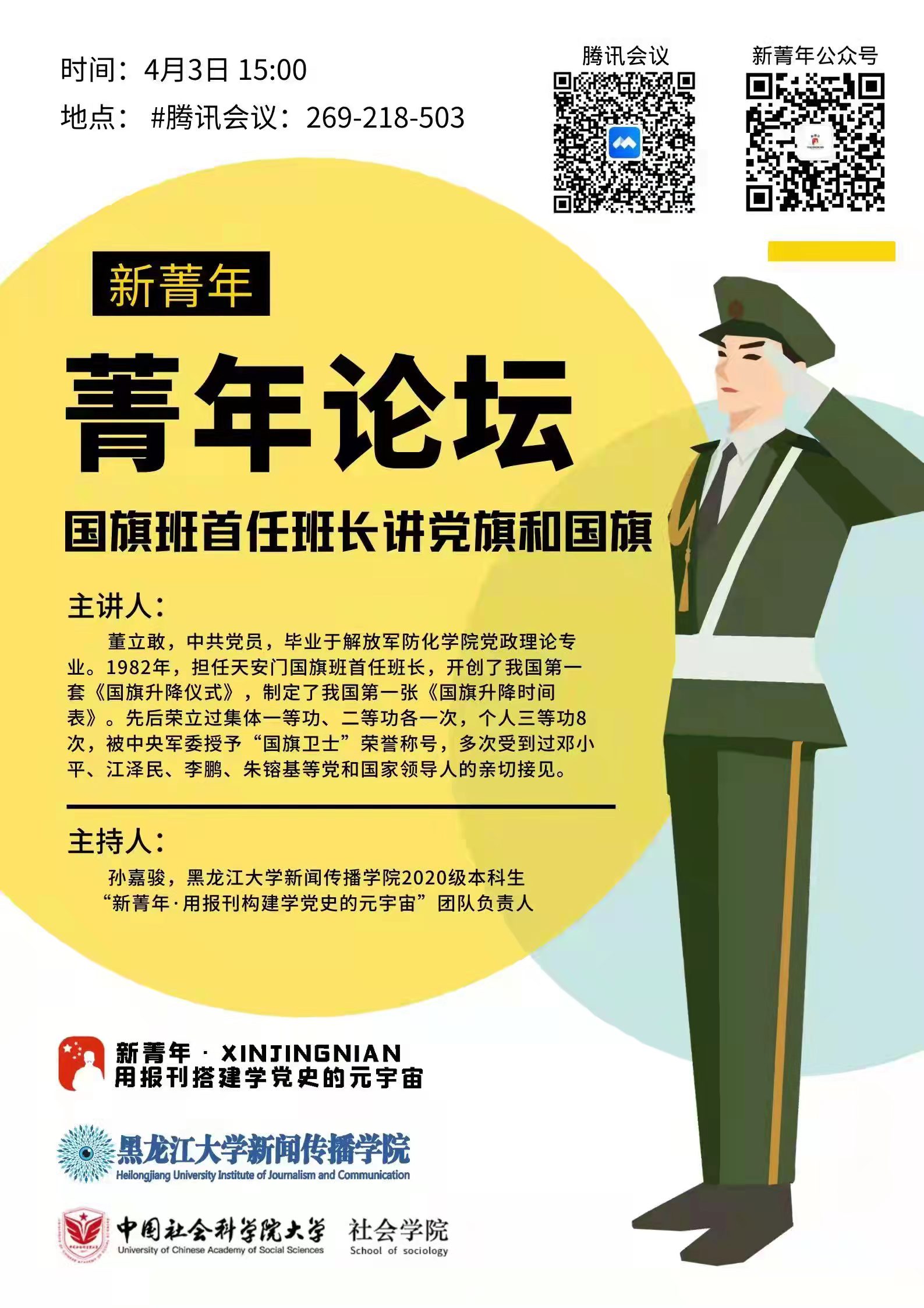 主讲人简介:董立敢,中共党员,毕业于解放军防化学院党政理论专业。1982年,担任天安门国旗班首任班长,开创了我国第一套《国旗升降仪式》,制定了我国第一张《国旗升降时间表》。先后荣立过集体一等功、二等功各一次,个人三等功8次,被中央军委授予“国旗卫士”荣誉称号,多次受到过邓小平、江泽民、李鹏、朱镕基等党和国家领导人的亲切接见。