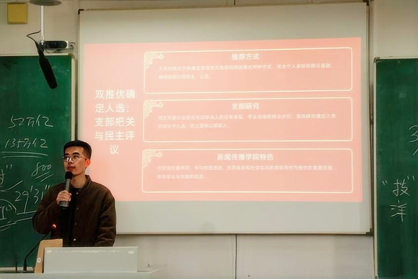 第四讲围绕发展党员流程及基本知识进行培训,学院团委副书记康景宇详细阐述了入党流程的各个步骤,帮助同学们明确了成为一名共产党员的规范路径与具体标准。