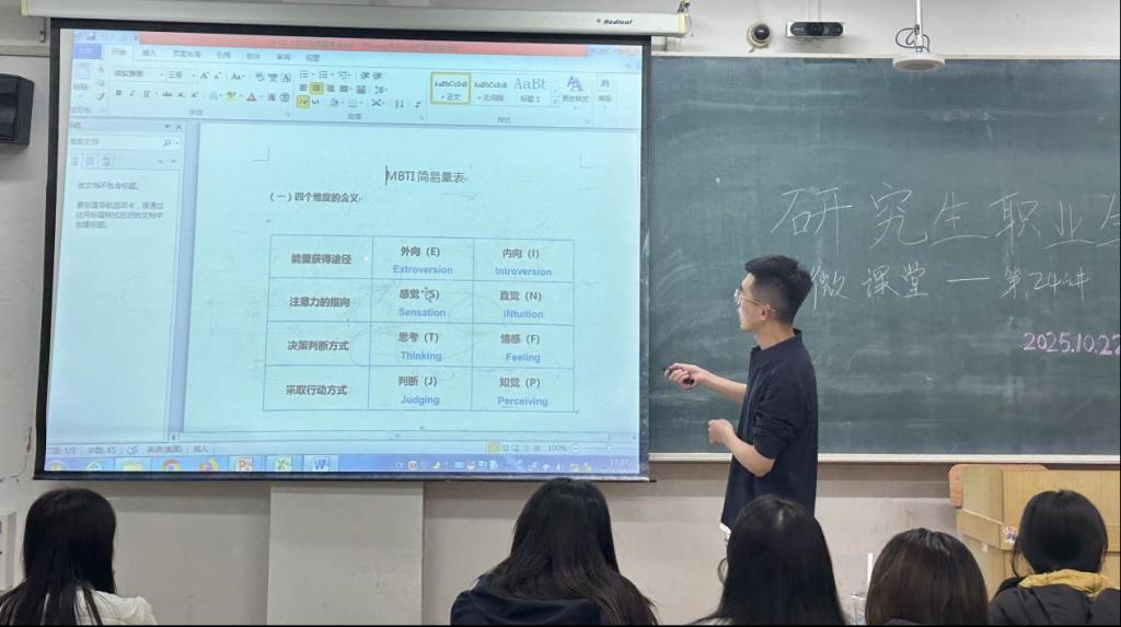 讲座伊始,康老师结合在贾杰老师讲座上学到的MBTI理论与简易量表,带领同学们进行了一场深入的自我探索之旅。通过性格类型的分析,同学们得以了解自身性格特质与潜在职业方向的匹配关系,为未来的职业选择提供了科学的人格心理学依据。