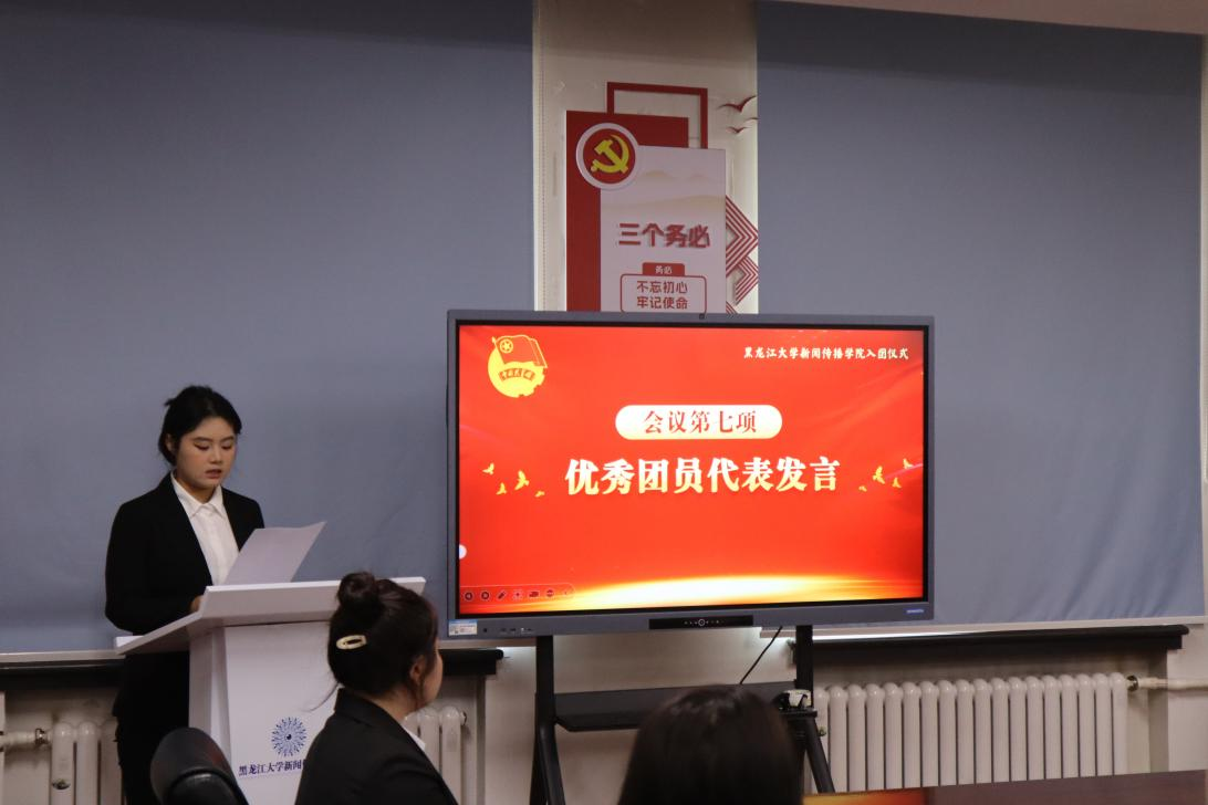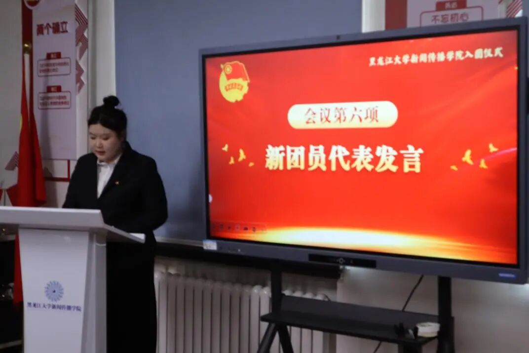 2024 级广告学专业吕铠冰作为新团员代表发言,她表示将以团章为遵循,牢记入团誓词,立足学生本职,勤奋钻研学业,积极参与社会实践,为团组织增光添彩,为民族复兴贡献青春力量。2024 级传播学专业韩思洋作为优秀共青团员代表,结合自身履职感悟,勉励新团员牢记入团初心,发挥先锋模范作用,主动担当作为,将个人理想融入国家发展大局。
