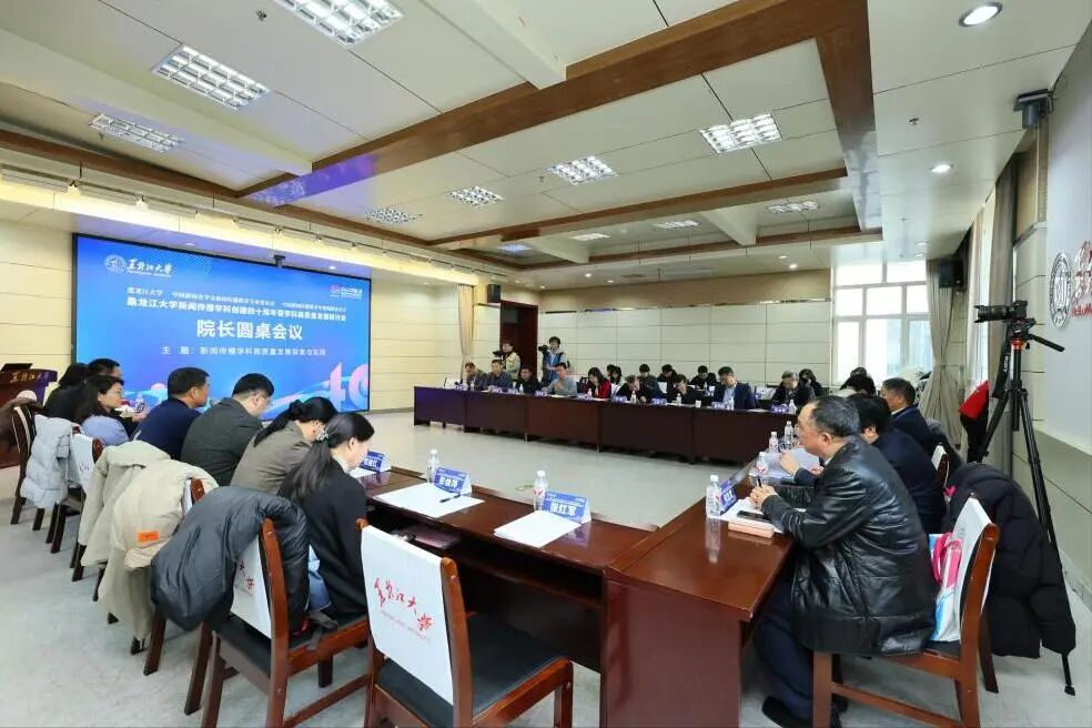 西北大学、中央民族大学、河南大学、中国地质大学、吉林大学、南京大学、华中科技大学、上海交通大学、北京体育大学、郑州师范学院、海南大学、新疆大学、江西师范大学、中国人民大学、湖北大学、河北经贸大学、辽宁大学、安徽大学、中国传媒大学、河北大学等20所高校新闻传播学院院长围绕“新闻传播学科高质量发展探索与实践”这一主题召开圆桌会议。黑龙江大学新闻传播学院党委书记江瑞主持会议。