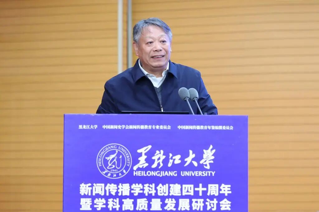 黑龙江省委宣传部副部长徐大勇致辞。他表示,黑龙江大学新闻传播学科深耕黑龙江省主流思想舆论构建,主动践行服务龙江社会发展的使命担当。希望与会专家学者以时代视野深入研讨交流,为全媒体信息化大背景下的新闻传播教育献计献策,共同做好新形势下的新闻舆论工作。