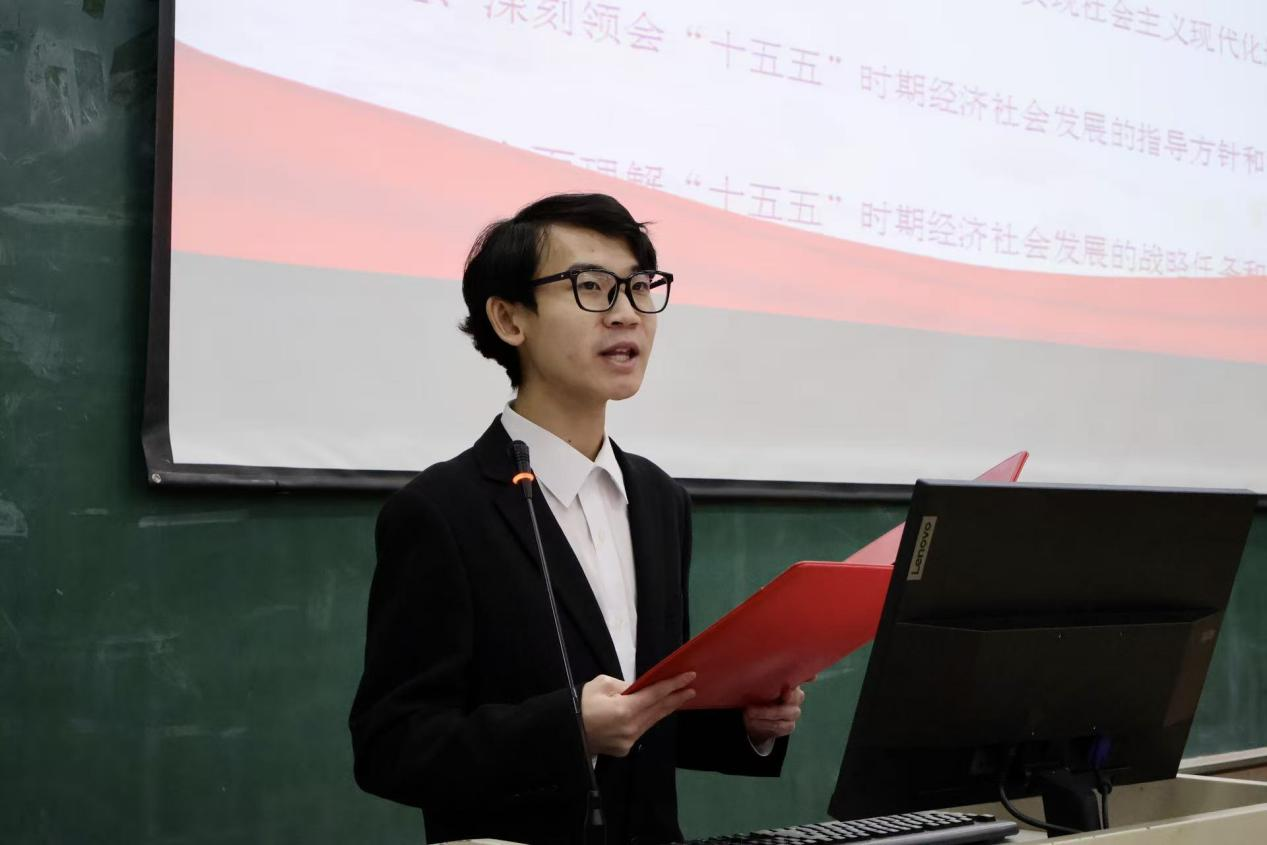 文学院高非凡结合《习近平谈治国理政》第五卷,分享了自身的成长故事。他谈到,自闭症儿童的主动拥抱、小学生的朗朗读书声、老人们布满皱纹的手让他深刻体会到“发展为了人民、发展依靠人民、发展成果由人民共享”的深刻内涵,坚定了“将论文写在祖国大地上”的信念,呼吁青年在专业学习、社会实践与志愿服务中担当时代使命。