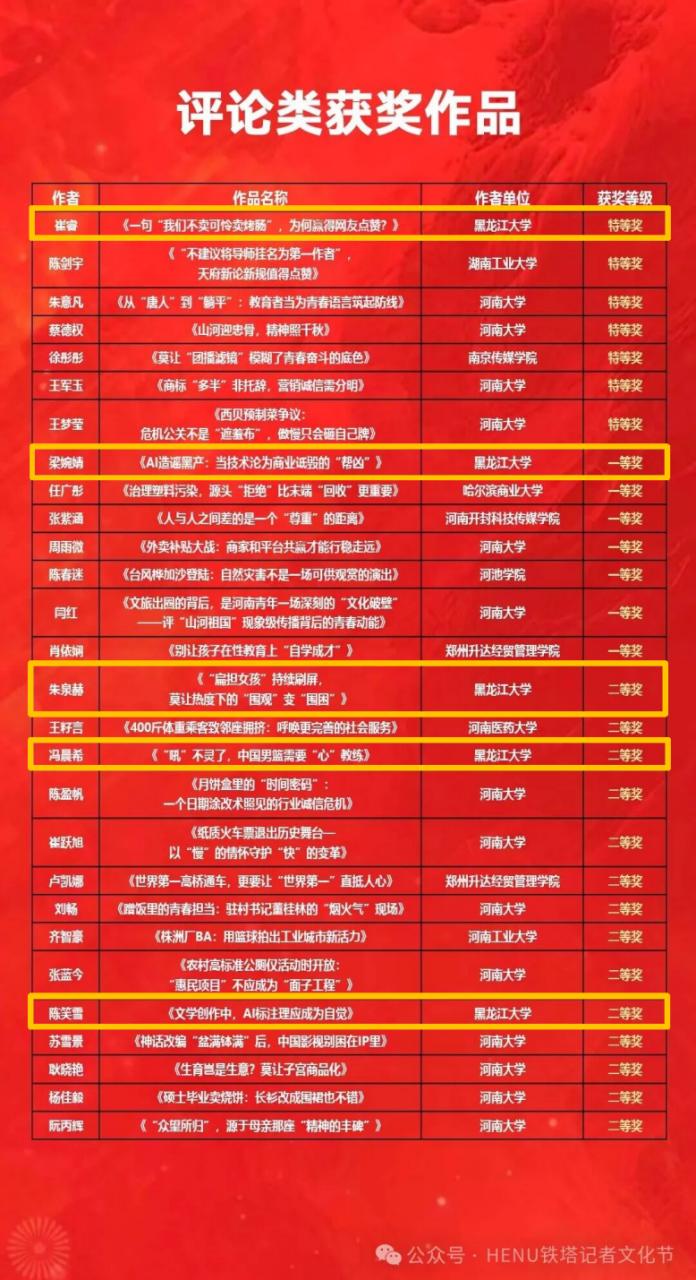 更值得关注的是,本届获奖作品大多源自学生们的课堂作业和实践成果。其中,评论类作品《一句“我们不卖可怜卖烤肠”,为何赢得网友点赞?》《“扁担女孩”持续刷屏,莫让热度下的“围观”变“围困”》《“吼”不灵了,中国男篮需要“心”教练》《文学创作中,AI标注理应成为自觉》来自我院老梁新闻评论班的课堂作业;消息类作品《开江民俗文化周趣味课堂:小学生变身“迷你冰雕师”》《文旅活动赋能非遗文化商品经济发展——佳木斯市举行“杏花游·十里江堤春游”主题系列庆典活动》是新闻消息写作课程中完成的平时作业;通讯类作品《守墓23年,只为一句承诺》与视频类作品《这位“公私分明”的母亲,有个儿子叫“铁人”》为我院学子校外实习产出的实践作品;视频类作品《最后的山神》则是我院“走中国·看家乡”专题实践项目的优秀成果。