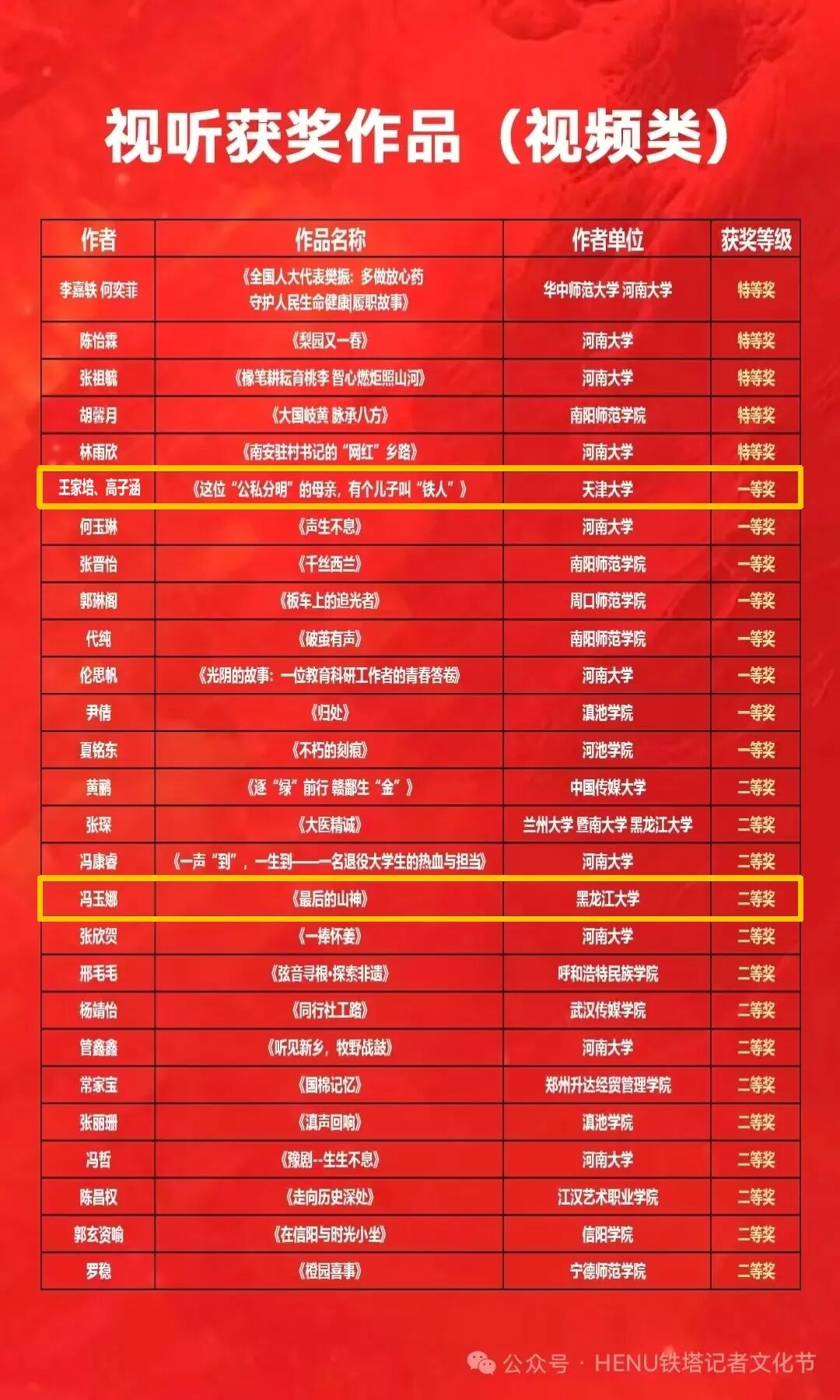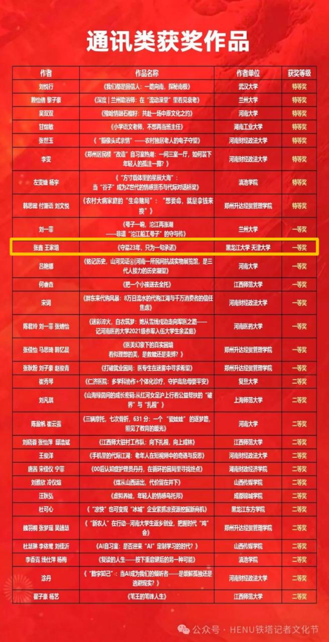 据“HENU铁塔记者文化节”微信公众号了解,该大赛是由河南大学主办,自2012年起持续打造的全国性校园新闻文化品牌活动。现已成为全国新闻传播领域极具影响力的学生实践与竞技平台,吸引着来自全国上百所高校的青年学子同台切磋。本届大赛以“奔赴新闻现场,感受青春力量”为主题,设有文字类、视听类、融媒体类三大类,并由高校专业教师与业界权威专家组成专业评审团,经过初审、复审与终审的严格评选,评出若干获奖作品。
