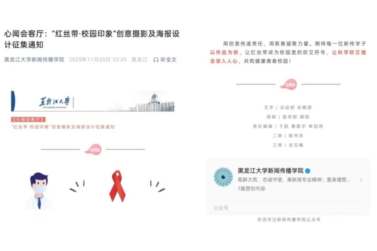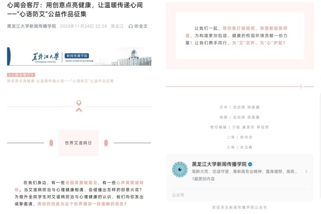 我院组织开展了“心语防艾”公益作品征集活动,通过发布多元作品征集计划,传递“携手同行、青春无艾”的倡导号召。活动共收到五件投稿作品,激发了学生融合专业学习与公益思考的创作热情,为构建包容性校园健康文化提供了多元表达载体。