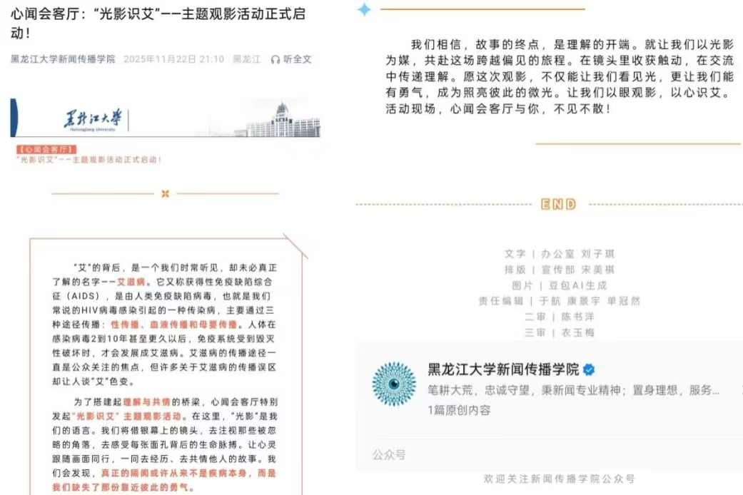 本次艾滋病预防教育宣传月系列活动,以普及科学知识、消除认知偏见、营造健康氛围、培育责任意识为宗旨,构建了立体化、浸润式的宣传教育体系,有效提升了学生的防艾认知水平与自我保护能力,进一步推动了心理健康教育与专业实践、校园文化的深度融合。未来,新闻传播学院将继续坚守育人初心,深化“五育并举”,不断创新健康教育形式与载体,为护航学子青春健康、营造友善和谐的成长环境持续贡献力量。(新闻传播学院供稿)