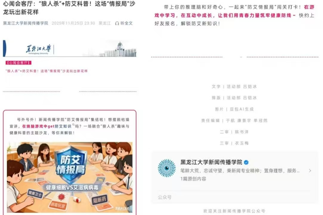 12月3日,“心闻会客厅”举办了“防艾情报局”主题推理沙龙。活动将“狼人杀”游戏机制与艾滋病防治知识深度融合,使参与者在沉浸式角色扮演与推理互动中,直观理解病毒传播特点与防护机制,推动了防艾科普从“被动听讲”向“主动体验”转变。
