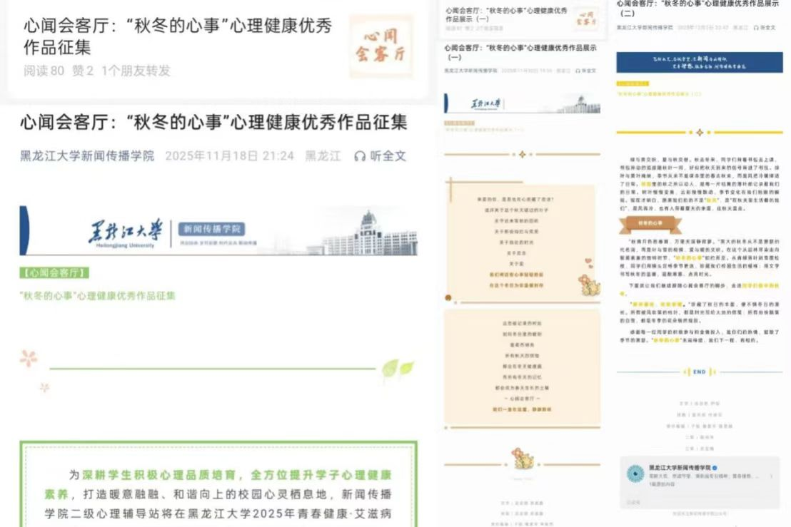 学院组织参加“秋冬的心事”心理健康优秀作品征集活动。活动围绕“暖心传递”与“秋冬拾趣”两大主题,鼓励学生以图文、音频、视频及自然拼贴等形式进行创作,有效拓展了心理教育的表达载体,激发了学生通过艺术进行自我觉察与情感表达的热情。