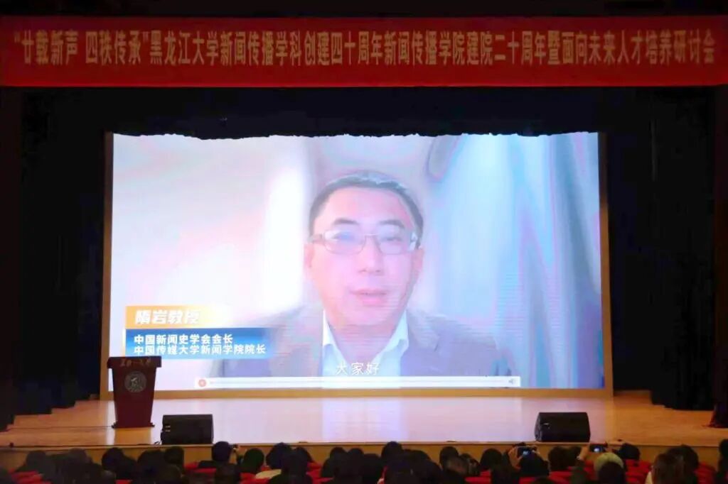 中国新闻史学会会长、中国传媒大学新闻学院院长隋岩在视频致辞中肯定了黑大新闻传播学科的建设成果。他指出,黑大新闻传播学院“扎根龙江、服务国家”,在人才培养、学术研究、社会服务等领域取得成果,并希望黑大新闻传播学院持续开展教育教学改革,推动新闻传播教育事业繁荣发展。