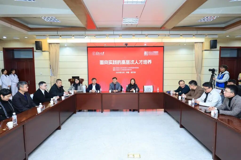 在人才培养平台揭牌环节,黑龙江报刊传媒集团、黑龙江新媒体集团及饶河县电商办负责人,分别与新闻传播学院名誉院长徐江善、党委书记江瑞、院长朱志勇共同为“产教融合研究生工作站”“教学实践基地”“数字商业创意传播产业学院”揭牌。
