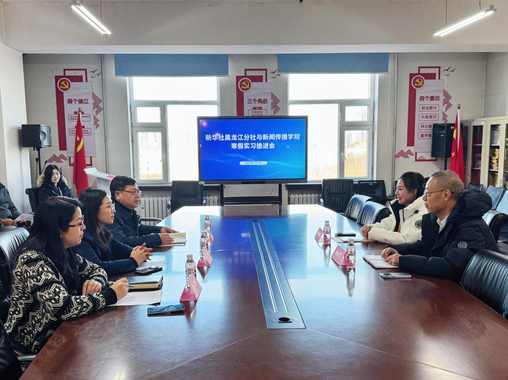 1月5日下午,新华社黑龙江分社与新闻传播学院共同举办寒假实习合作推进会。新华社黑龙江分社总编室编委、工会主席徐宜军,新华社黑龙江分社机关党委委员、《高管信息·黑龙江》主编、中国经济信息社黑龙江经济研究中心新华舆情总监郭御凤,新闻传播学院党委书记江瑞、院长朱志勇、党委副书记衣玉梅,以及15名本硕学生代表出席会议。会议围绕寒假学生实习安排展开深入交流,并就双方合作和协同育人达成共识。