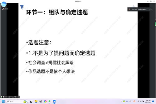 好的选题是成功的一半,老师在环节一主要讲述了如何从生活中发现社会问题,并从中找到切入点进行调查研究。讲者以自己的经历为例,强调了在社会调查中关注和思考的重要性。老师提醒大家在日常实践中寻找选题,并强调了选题取向的重要性,即关注重大新闻事件中的相关问题。在进行选题时要注意首先,选题不是为了提问题而确定,而是要看到自己的所处环境,提炼出具体的主题和内容。其次,不要盲目接受社会黑暗面,要提建设性的意见。再次,要避免给他人下定义,要客观地呈现。最后,要提炼出具体的调查对象,避免过于空泛的议题。总之,选题时要注重实际问题意识,提炼出具体的主题和内容。在选题前,要进行预调研,了解已有的基础调研优势和机会。在实施阶段,要合理安排时间,避免拖延。同时,要关注选题的变化,确定调查角度和写作模式。最后,提醒同学们不要拖延到最后一刻,要按时完成作品。
