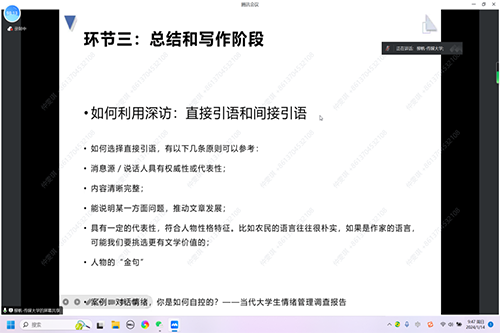 此外老师还讲述了如何将客观报道转化为调查报告,并强调了在写作过程中需要注意的问题。首先,要有一个好的调查结构,一个好的调查结果,然后用适当的语言和数据来展现自己的观点。其次,要注意语言的使用,避免使用直接引语,因为这样可能会让听者感到困惑。最后,要与大学生创新创业计划项目等创新实践项目相结合,深入分析其侧重点,以获得更完善的作品。